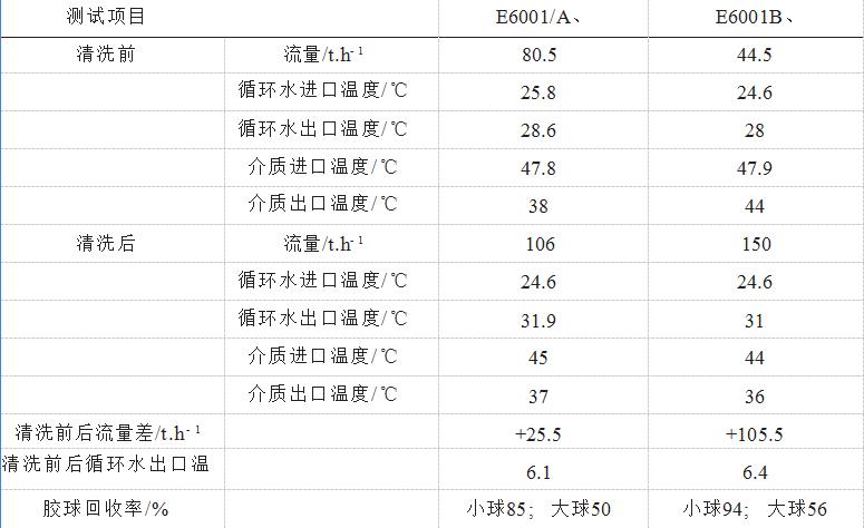 3.1此次清洗先使用Φ18mm膠球,后使用Φ20mm膠球分兩次對E6001/B、A進行清洗,E6001/B小球的回收率為94%(投放膠球210個,回收197只)。從現(xiàn)場目測的效果看,E6001/B組的循環(huán)水管線結(jié)垢多,清洗出的懸浮物濃度高,水質(zhì)差;E6001/A循環(huán)水中的懸浮物稍少于E6001/B,其循環(huán)水質(zhì)較混。
