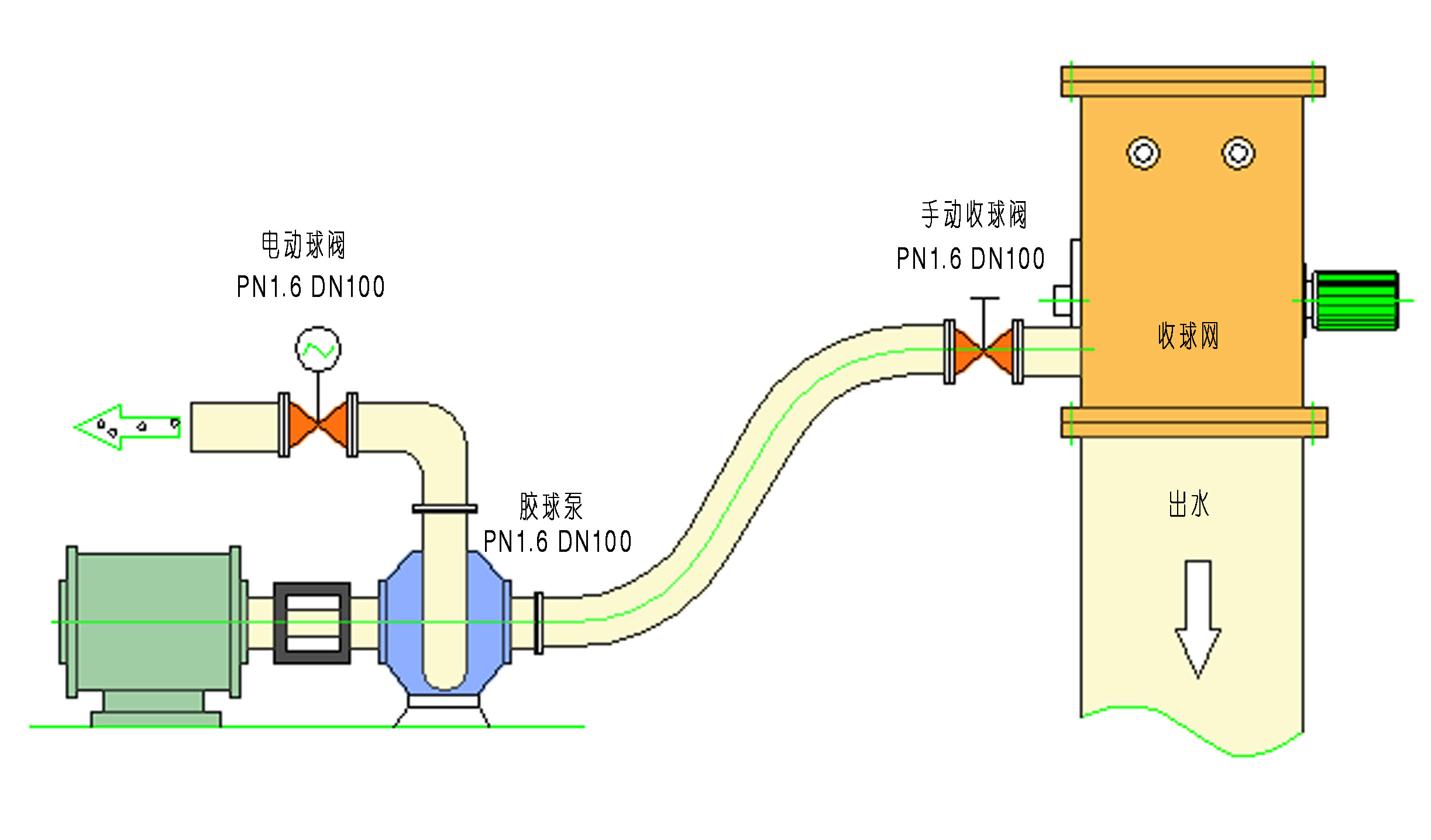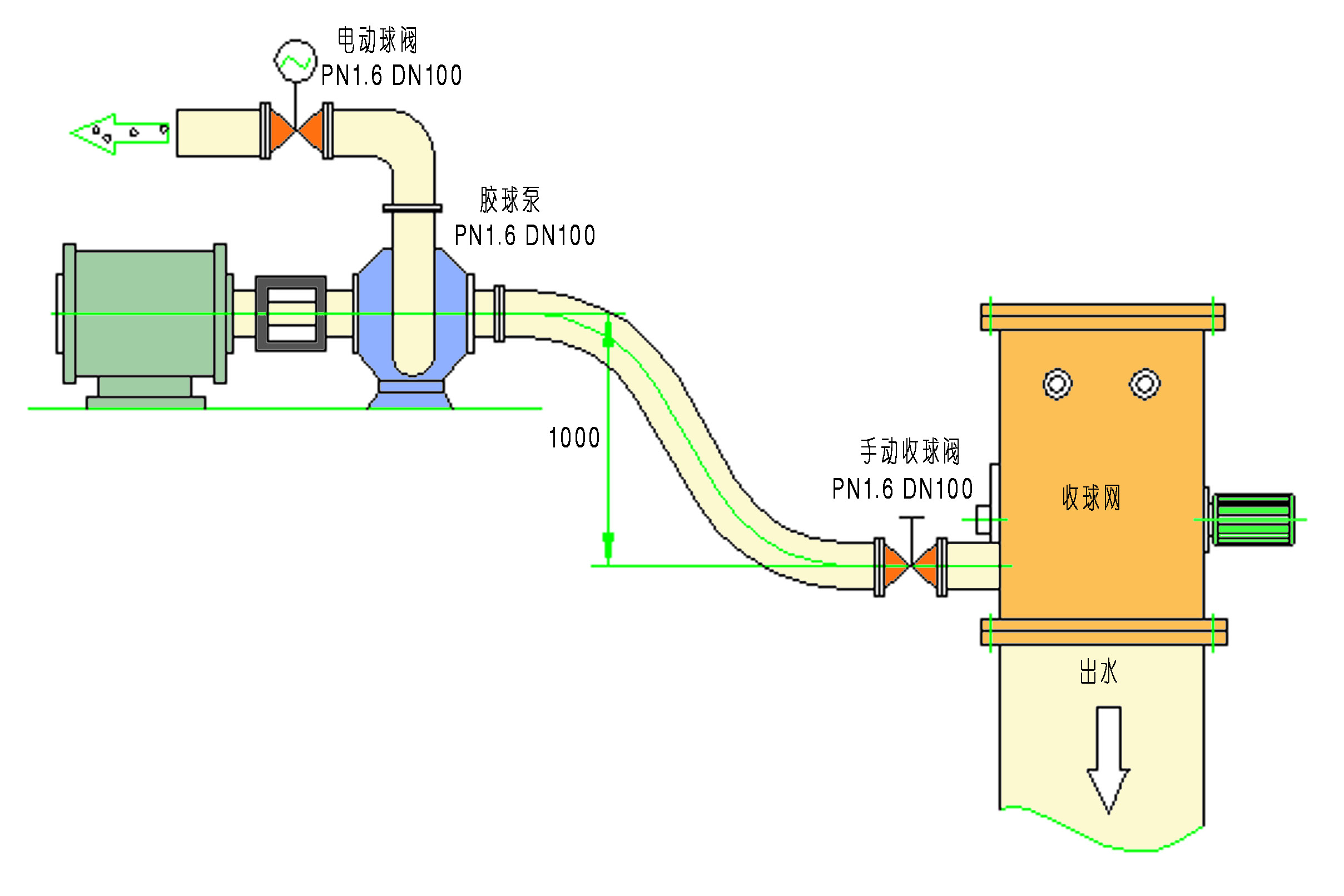 1、膠球泵與收球網(wǎng)收球管接口位置