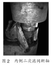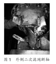 (1)膠球清洗二次濾網(wǎng)動(dòng)力軸和排污斗短軸直徑90mm,軸頸過小,在連續(xù)旋轉(zhuǎn)過程中膠球清洗二次濾網(wǎng)受水流沖擊較大,在運(yùn)行過程中共出現(xiàn)6次動(dòng)力軸和短軸斷裂事故,如圖1和圖2所示。