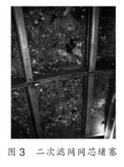 膠球清洗二次濾網(wǎng)網(wǎng)芯孔徑過小,僅為中8mm,運(yùn)行過程中垃圾極易造成網(wǎng)芯的堵塞(圖3)。在夏季垃圾.較多時(shí)期,每臺(tái)膠球清洗二次濾網(wǎng)平均每兩.周需要清理一次。當(dāng)膠球清洗二次濾網(wǎng)隔離人工清理時(shí),凝汽器鈦管水側(cè)出現(xiàn)斷水,在凝汽器汽側(cè)汽流沖擊下?lián)Q熱管束的振動(dòng)增大,造成管束和管板間磨損。另外,隔離時(shí)鈦管會(huì)出現(xiàn)溫度升高現(xiàn)象,致使鈦管膨脹加長。由于兩側(cè)管板間距變化較小,鈦管膨脹加長后會(huì)產(chǎn)生拱起彎曲,與管隔板間的磨損加劇。上述因素極易造成鈦管的磨損穿孔,致使凝汽器出現(xiàn)泄漏,影響機(jī)組整個(gè)汽水系統(tǒng)的安全。