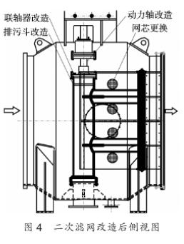 (②動(dòng)力軸改造。將原來的膠球清洗二次濾網(wǎng)動(dòng)力軸(上軸)更改為雙相不銹鋼材質(zhì)的軸,軸徑由目前的90mm改造為120mm,軸受剪切力F=3.14rσ,其中,σ為屈服強(qiáng)度,r=中/2。經(jīng)過計(jì)算,新軸剪切力.約為原軸的1.8倍。軸與減速箱連接尺寸不變。