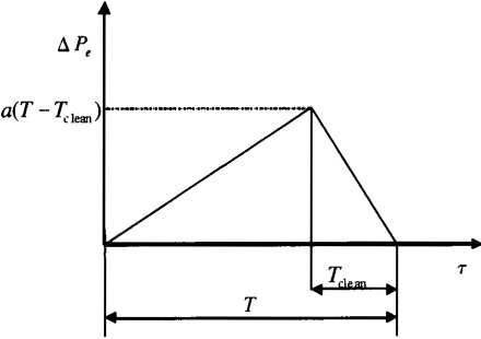 通過測取機組清潔率隨時間變化的曲線,就可以得到由于臟污使汽輪機排汽壓力Pc隨時間的變化關(guān)系。即:p,-=fM, ⑴其中,岳為汽輪機排汽壓力,Pa。由汽輪機功率Pe隨排汽壓力變化關(guān)系曲線,得:P哉(公),⑵結(jié)合式(1)和式(2),可以得到由于臟污所引起的汽輪機功率隨時間的變化式:ARHS),⑶其中,△四為臟污所引起的汽輪機功率的變化值,kWo當(dāng)清洗系統(tǒng)投入運行時,污垢的清除也是逐漸進行的,隨著清洗過程的繼續(xù),由臟污所造成的損失逐漸減小,直至清洗時間K噸后,臟污所引起的損失達到零,在清洗過程中汽輪機功率隨時間的變化式如下。AF"),⑷其中,Ape為在清洗過程中汽輪機功率的變化值,kW0為簡化計算,在不長的時間間隔內(nèi),可以將功率損失曲線近似作直線處理,如圖1所示。