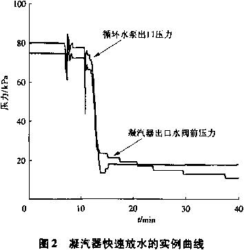 凝汽器快速放水的缺點是:可能會產生循環水泵倒轉的情況,由于循環水泵葉輪一般是采用套裝的軸套,上有絲扣擰在軸上,擰的方向與軸轉動方向相反。所以,當泵順轉時,就愈擰愈緊,如果反轉就容易使軸套退出,葉輪松動會產生摩擦。另外,循環水泵葉輪兩側的軋蘭填料也存在同樣情況,反轉可能會使填料松動,漏水。單位3套S109FA機組循環水系統多次試驗中快速放水時,在沒有釆用限流措施的情況下(凝汽器水側自動透氣閥全開,循環水泵的出口液控蝶閥全開),現場也未見循環水泵倒轉。再例:由于凝汽器兩側出水閥關閉不嚴,按正常方式放水,整整24h,也未將水放盡,后通過凝汽器快速放水法,15min解決問題。所以,當采用限流措施快速放水時,應該更安全,只要確保凝汽器兩側出水閥可靠關閉即可,實際快速放水實例曲線如圖2所示。