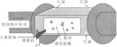 自動監測系統示意圖如圖1所示。該系統可以自動地監測回收膠球的數量及其半徑,這樣運行人員就可以根據檢測結果適時地添加或更換膠球,保證膠球的數量以及質量,以期達到佳的清洗效果。通過多次試驗,攝像機的佳有效位置及其范圍得以確定,并根據強度承受力和光照特點選擇了合適的材料。本系統硬件配置如圖2所示,其中透明管道材料為鑄造鋼、光學玻璃,管道內側不同角度裝有頻閃燈,攝像機拍攝角度垂直于密封玻璃面,拍攝焦距可調。
