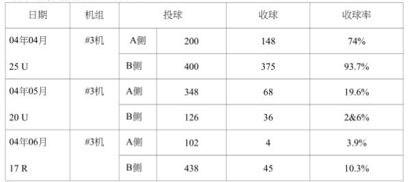 從表中可以看出,#3機膠球清洗裝置系統收球率確實很低(平均收球率4.8%)。